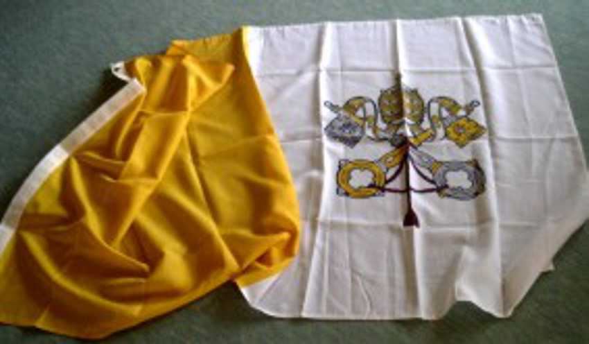 Kirchen FahneVatikanHiss Fahne 90 x 150FÜR DRINNEN & DraußenHiss Fahne 90 x 150 cm:Polyester,ca. 85g/qm (oder schwerer),Kanten doppelt umsäumt,links Besatzband mit 2 eingeschlagenen Metallösen.