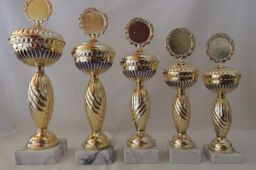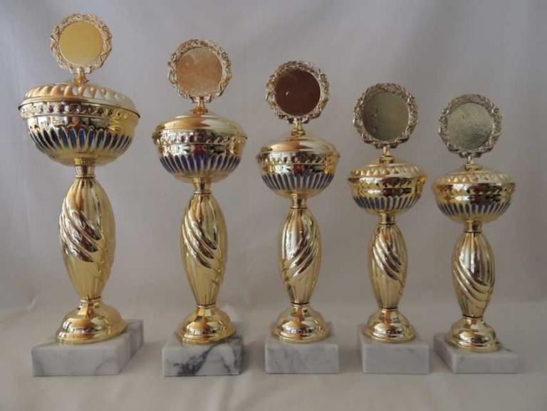 Farbe gold mit blauPokalkelch, Deckel und Deckelaufsatz aus Metall !Deckelaufsatz für 50mm EmblemeSockel aus Marmor!Ø Kelch 12/10/9/8/8cmHöhe ca.: 39/35/32/30/29cm